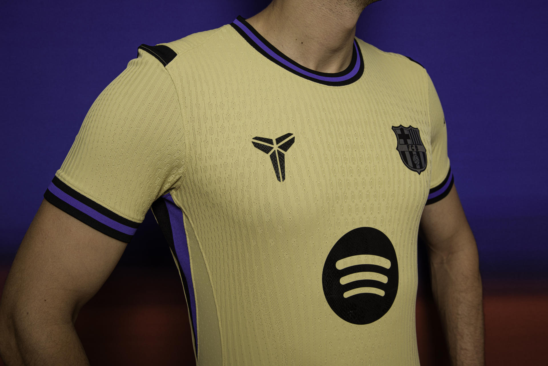 El logotipo de Spotify aparece en negro y se mantiene centrado en el pecho, mientras que en la manga izquierda figura el logo de Ambilight en las camisetas del equipo masculino y el de Bimbo, en las del femenino, ambos también en color negro.