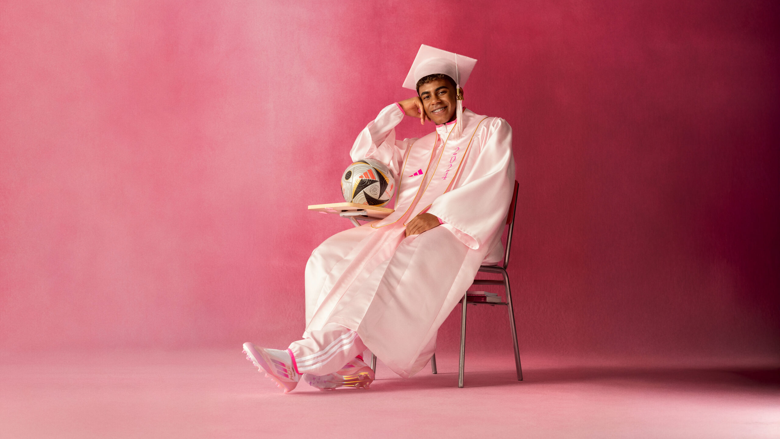 En la presentación de los botines, destaca el color rosa, que precisamente es el predominante en los botines, y se observa al jugador con una vestimenta de graduación, haciendo alusión a que durante este 2024, además de conseguir éxitos deportivos, también finalizó la escuela secundaria.