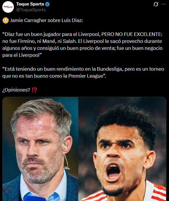 En declaraciones para Sky Sports, la leyenda de la Premier League, Jamie Carragher, no dio crédito de lo que está haciendo Luis Díaz y rebajó su paso por el Liverpool. “Díaz fue un buen jugador para el Liverpool, pero no fue excelente: no fue Firmino, ni Mané, ni Salah. El Liverpool le sacó provecho durante algunos años y consiguió un buen precio de venta; fue un buen negocio para el Liverpool”, dijo Carragher.