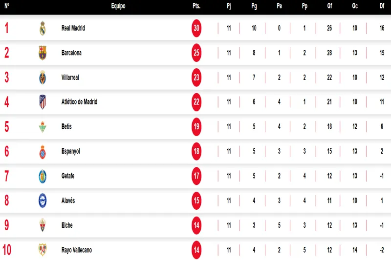 En la zona media de la tabla, Real Betis y Espanyol rondan entre los 18 y 19 puntos, mostrando un rendimiento irregular pero competitivo. Equipos como Real Sociedad y Athletic Club se mantienen cerca, buscando acercarse a posiciones europeas y evitar descolgarse demasiado temprano.