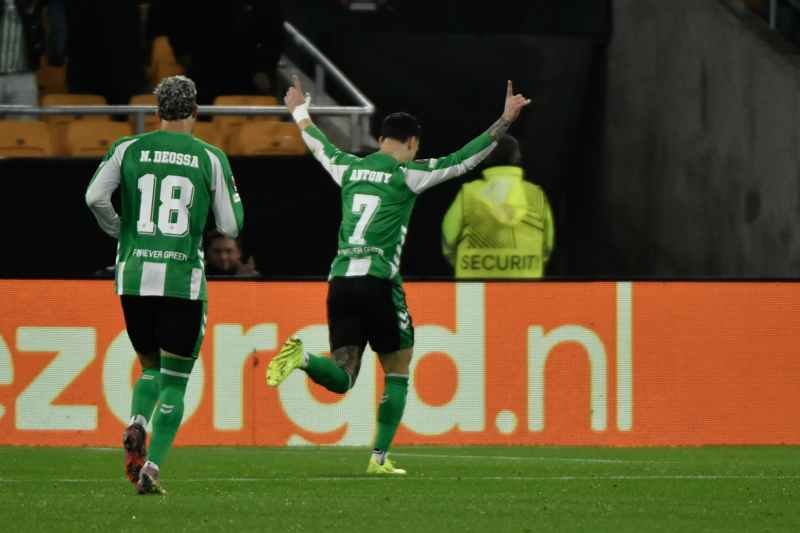 SEVILLA, 29/01/2026.- El delantero del Betis Antony dos Santos (d) celebra su gol, primero del equipo andaluz, durante el partido de la octava jornada de la UEFA Liga Europa que Real Betis y Feyenoord disputan hoy jueves en el estadio de La Cartuja, en Sevilla. EFE/ Raúl Caro.