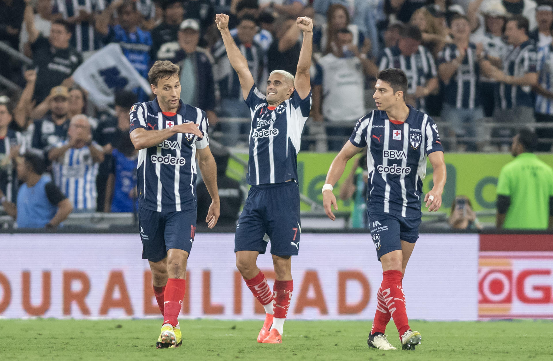 Germán Berterame (c), de Monterrey, festeja un gol ante Pumas, en el partido correspondiente al Play In 2 del Torneo Clausura mexicano. EFE/Miguel Sierra
