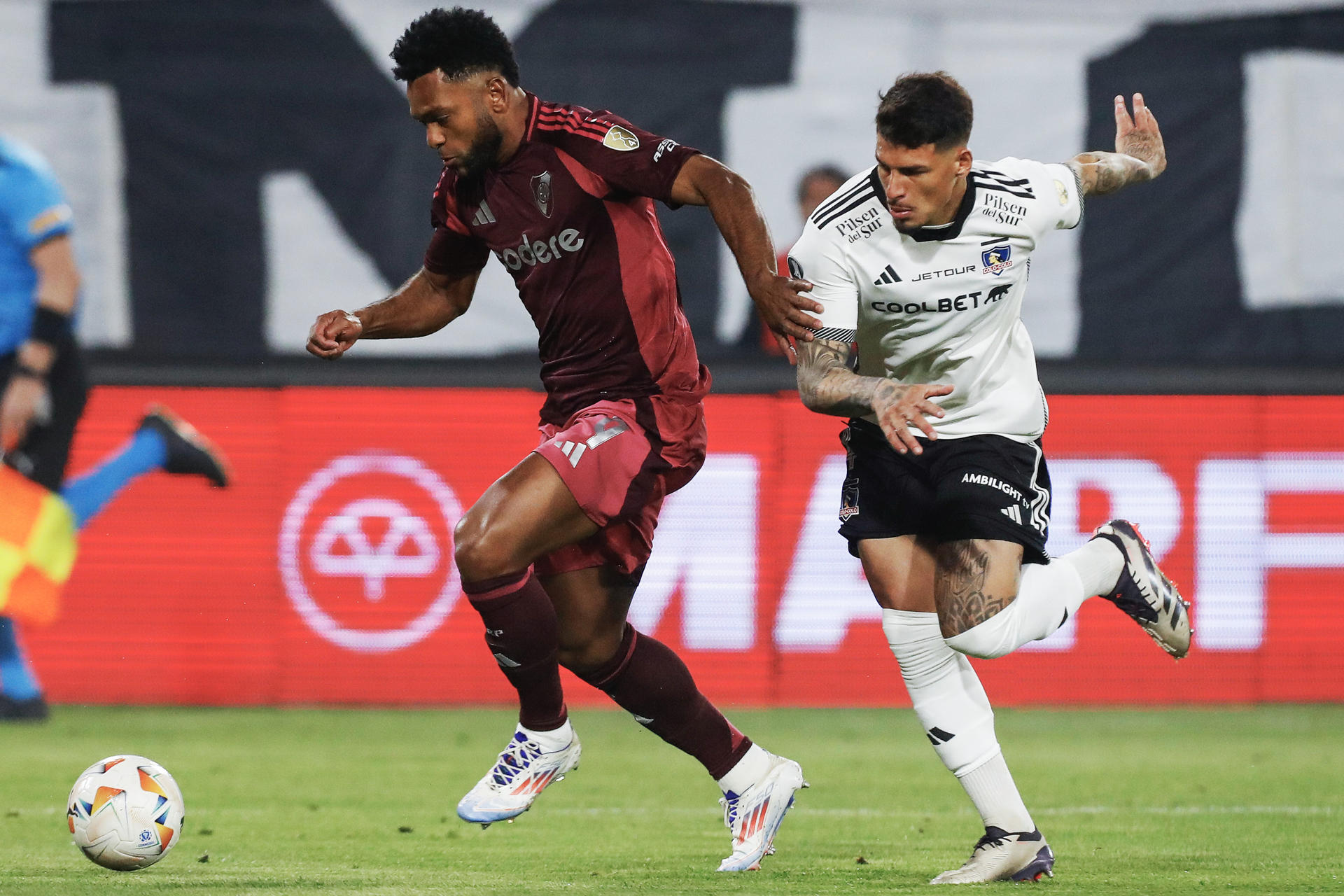 Alan Saldivia (d) de Colo Colo disputa un balón con Miguel Borja de River en el partido de ida de cuartos de final de la Copa Libertadores. EFE/ Osvaldo Villarroel