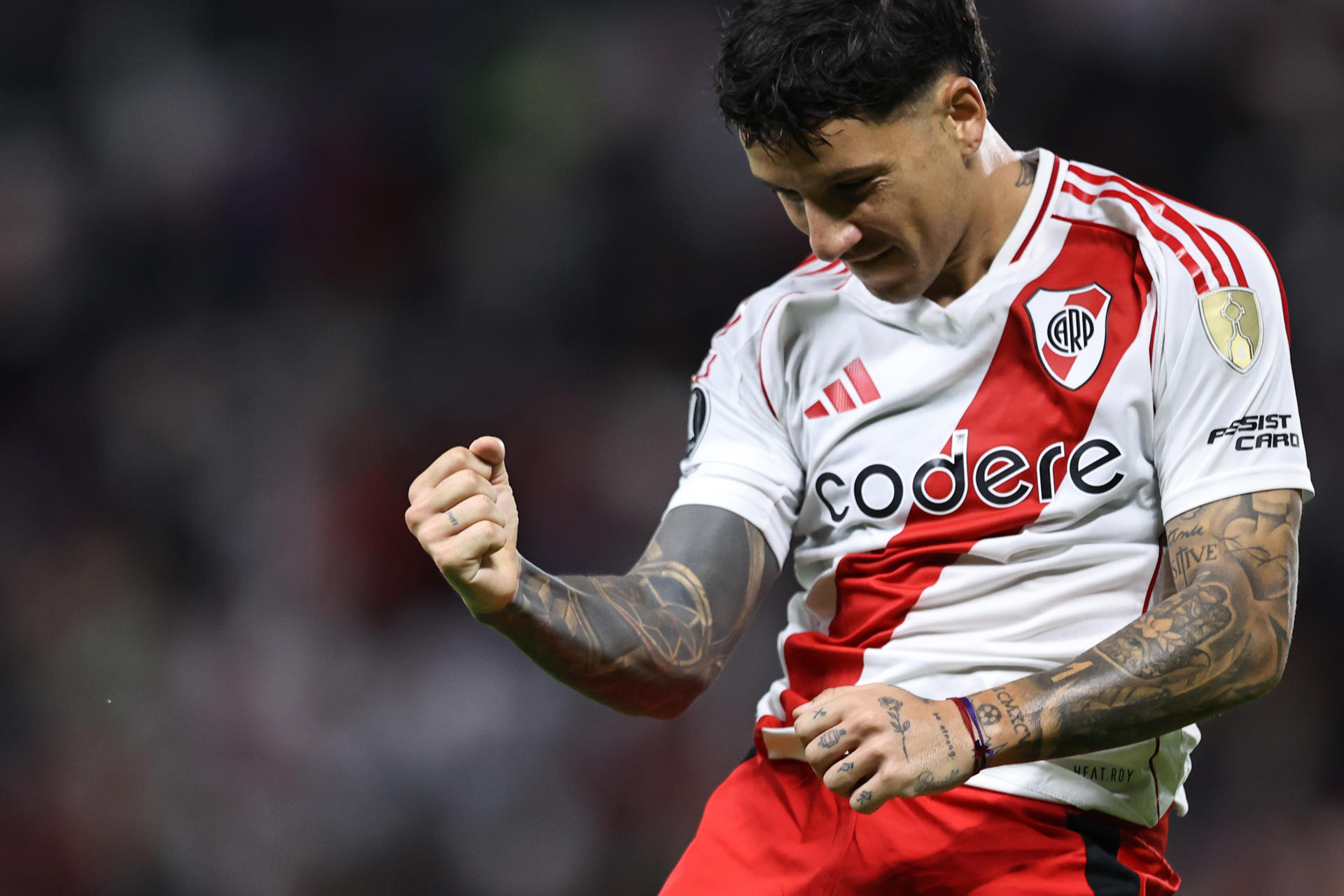 Sebastián Driussi de River Plate celebra un gol ante Independiente del Valle en un partido de la fase de grupos de la Copa Libertadores. EFE/ José Jácome