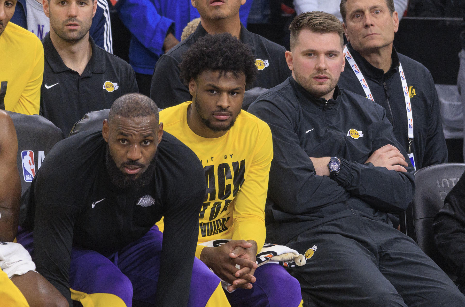 Luka Doncic (d), junto a LeBron James (i) y Bronny James (c), durante el partido de la NBA disputado en el estadio Intuit Dome entre Los Angeles Clippers y Los Angeles Lakers (Estados Unidos). EFE/ Javier Rojas