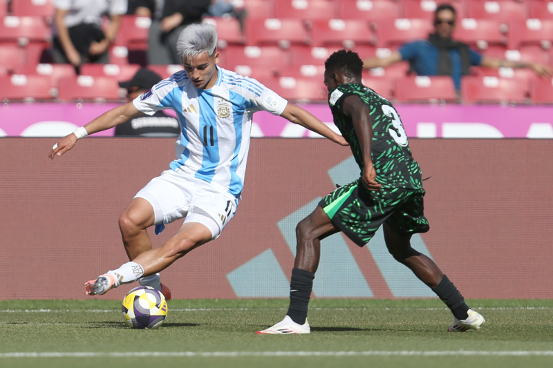 AMDEP5637. SANTIAGO (CHILE), 08/10/2025.- Ian Subiabre (i) de Argentina disputa un balón con Odinaka Emmanuel Okoro de Nigeria este miércoles, durante un partido de octavos de final de la Copa Mundial Sub-20 entre Argentina y Nigeria en el estadio Nacional Julio Martínez Prádanos en Santiago (Chile). EFE/ Ailen Díaz